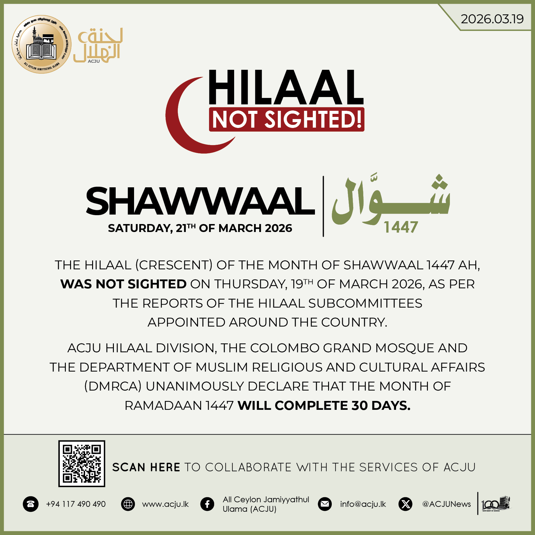 In an official announcement, the Hilal Division of the All Ceylon Jamiathul Ulama (ACJU), together with the Colombo Grand Mosque and the Department of Muslim Religious and Cultural Affairs (DMRCA), unanimously declared that the month of Ramadan 1447 AH will complete 30 days.