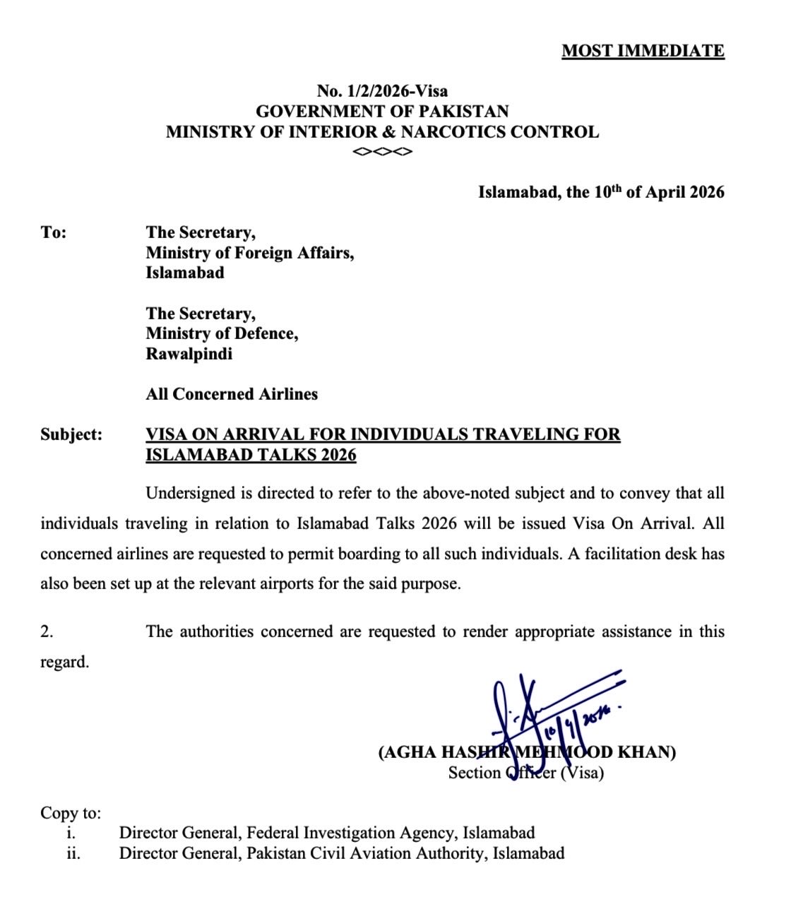 He said Pakistan’s immigration authorities will issue visas on arrival, facilitating the movement of attendees for the high‑profile diplomatic engagement.