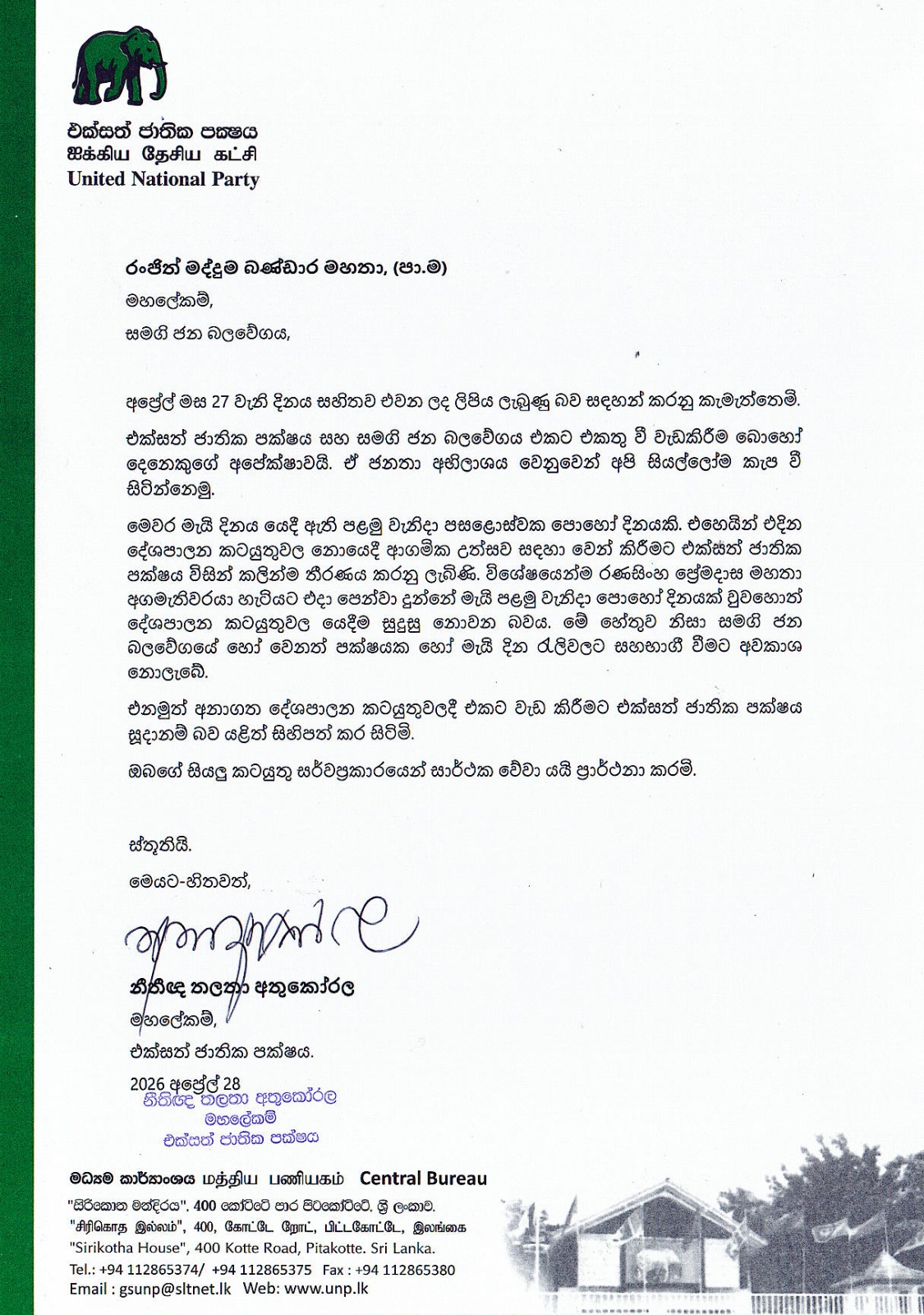 COLOMBO (News 1st); United National Party (UNP) General Secretary Thalatha Athukorala has formally responded to a letter sent by Samagi Jana Balavegaya (SJB) General Secretary Ranjith Madduma Bandara, clarifying the UNP’s position on cooperation between the two parties and its decision regarding May Day activities.