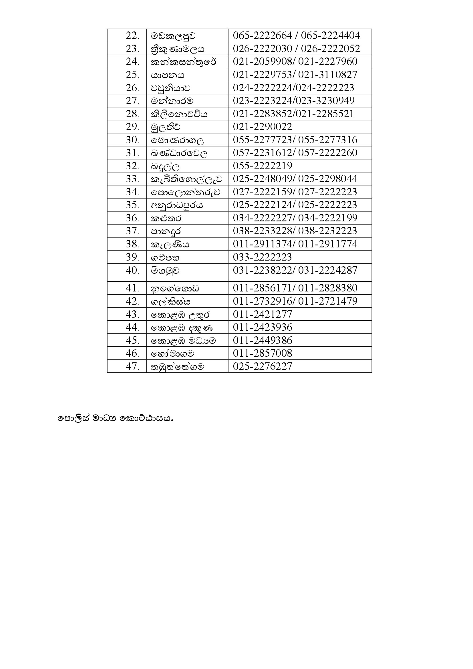 COLOMBO (News 1st); As severe weather continues to wreak havoc across the island, the Sri Lanka Police has published a comprehensive list of emergency contact numbers for 47 divisional operations centers to assist the public during floods, landslides, and other disaster-related emergencies.