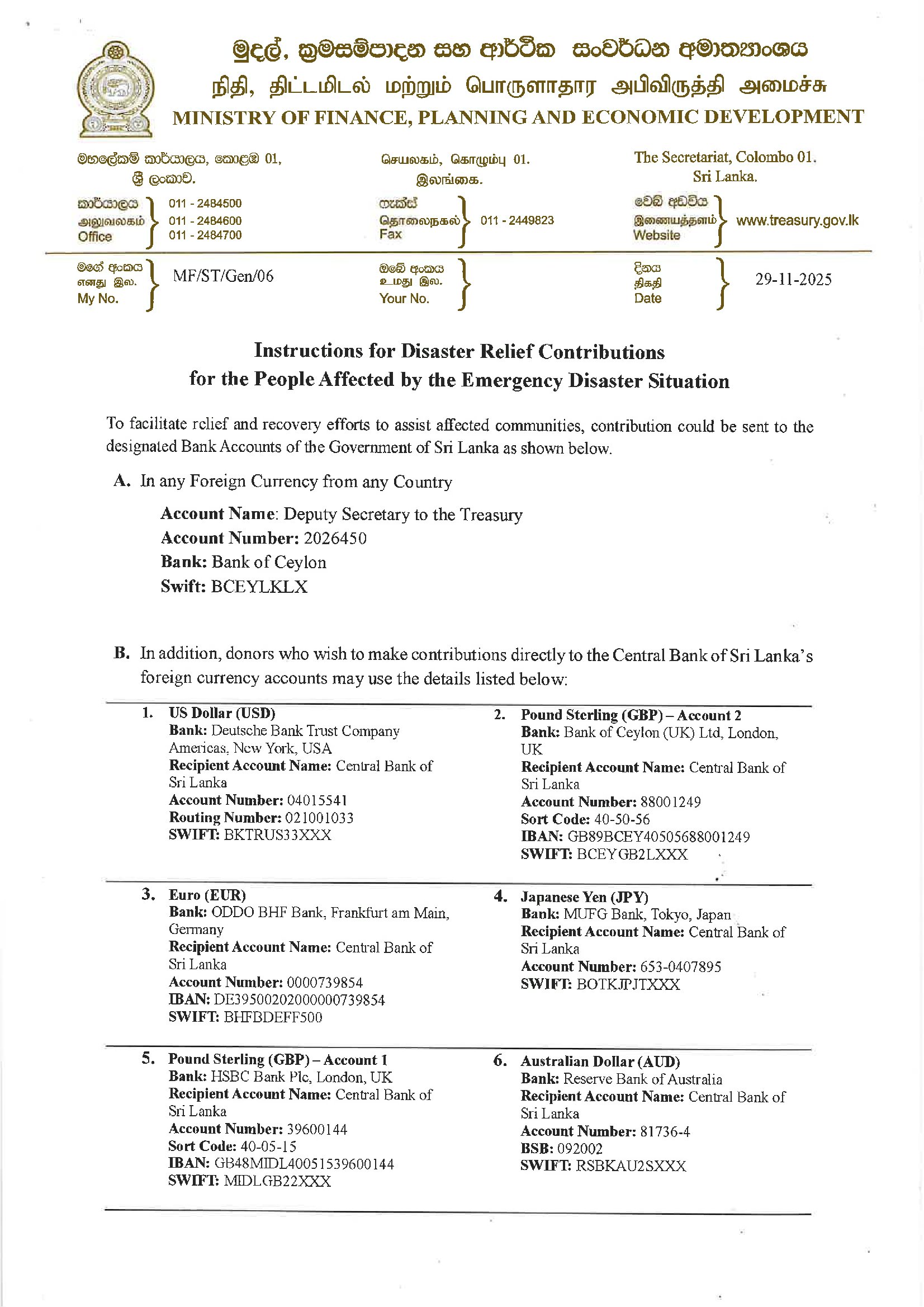 According to the Ministry of Finance, Planning and Economic Development, contributions can be made in any foreign currency to the designated account of the Deputy Secretary to the Treasury at the Bank of Ceylon (Account No: 2026450, SWIFT: BCEYLKLX).