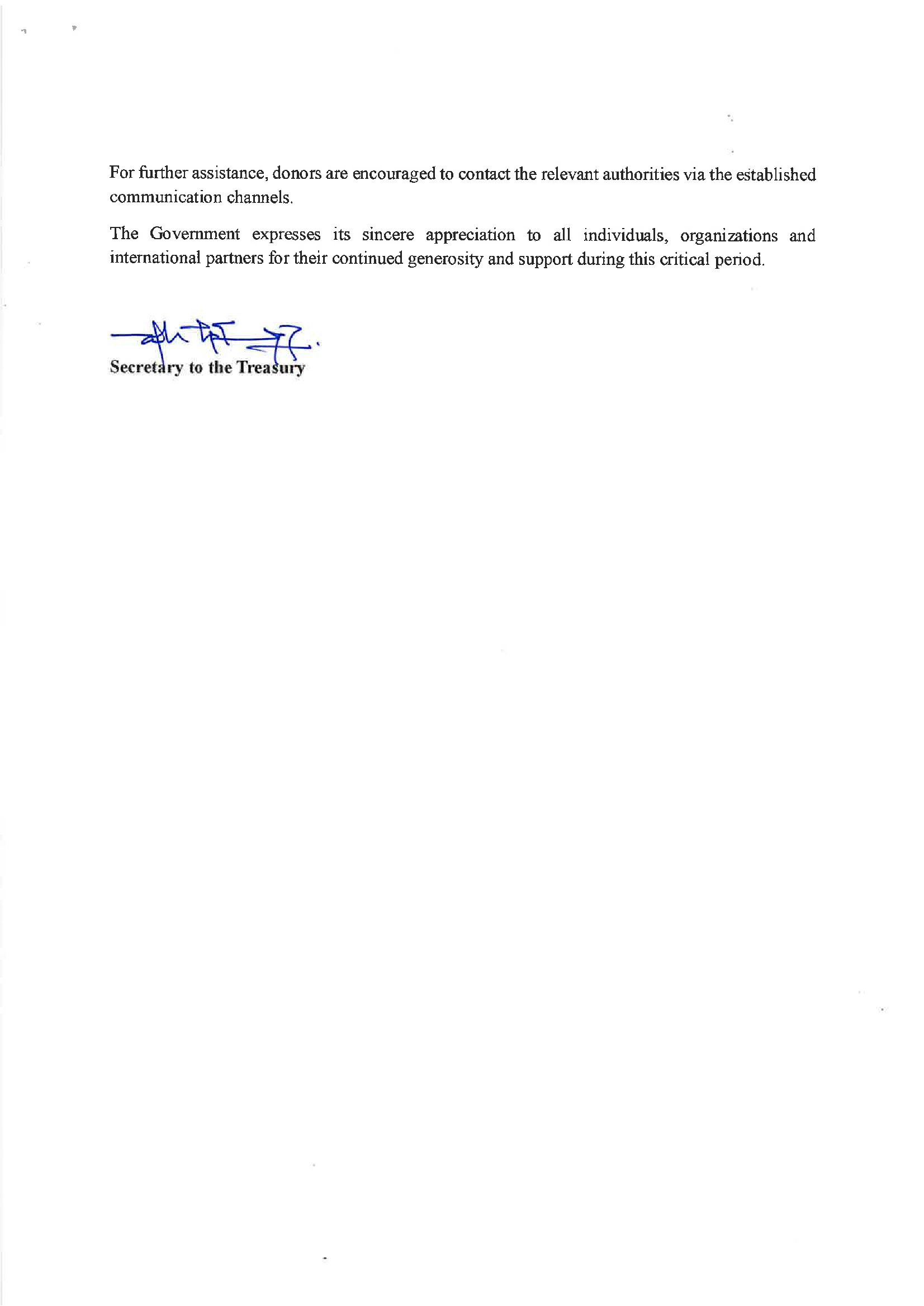 The Government expressed its sincere appreciation to all individuals, organizations, and international partners for their generosity and support during this critical period.