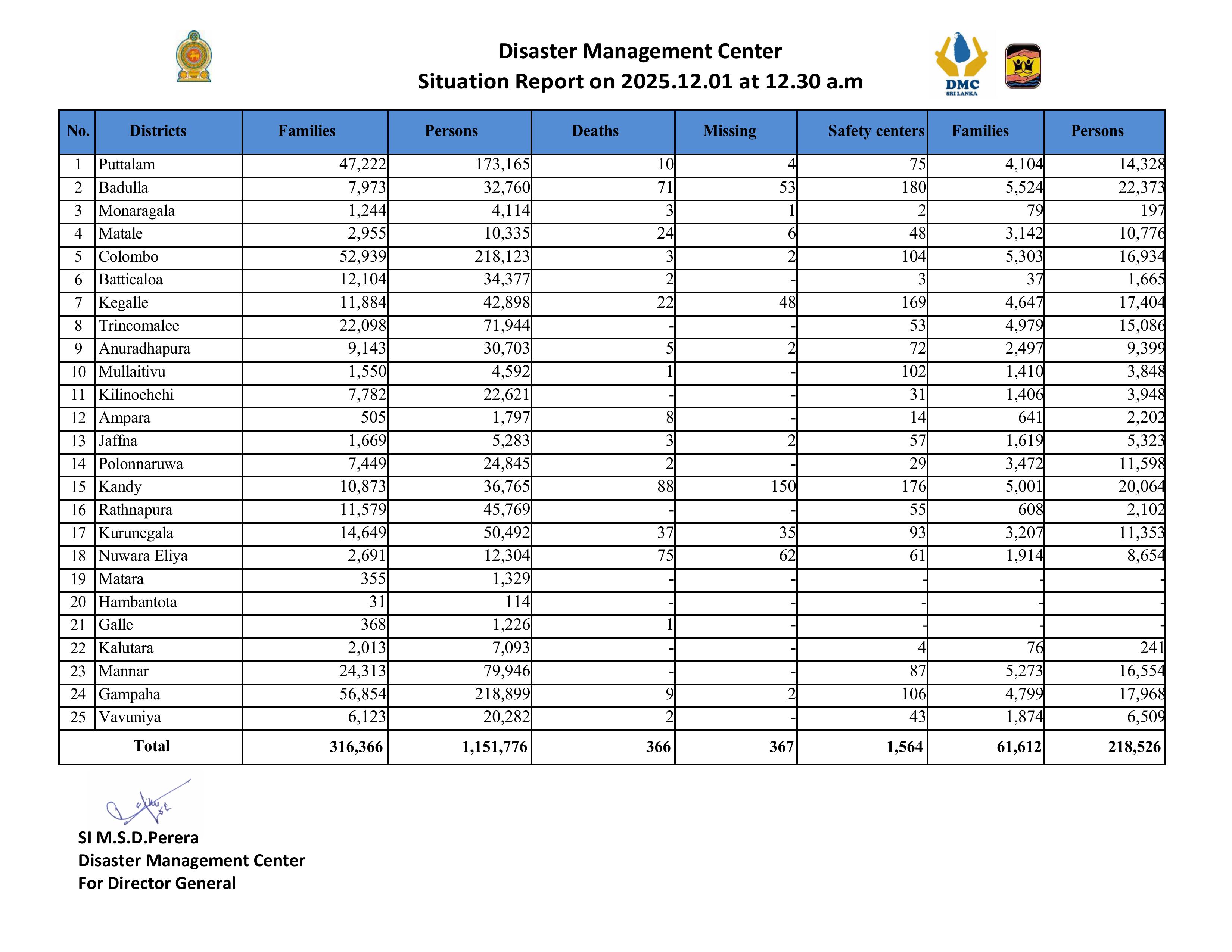 According to the Disaster Management Centre’s latest situation report, 1,151,776 people from 316,366 families across all 25 districts have been affected by severe floods and landslides triggered by relentless rains.