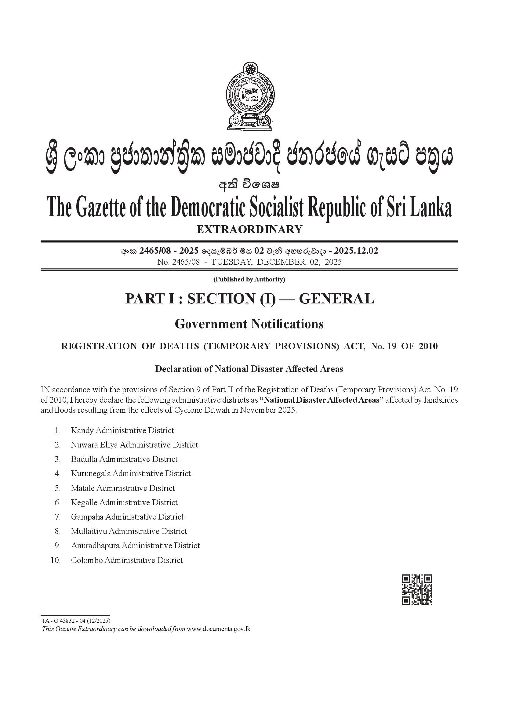 COLOMBO (News 1st); The Government of Sri Lanka has officially declared 22 administrative districts as National Disaster Affected Areas under the provisions of the Registration of Deaths (Temporary Provisions) Act, No. 19 of 2010.