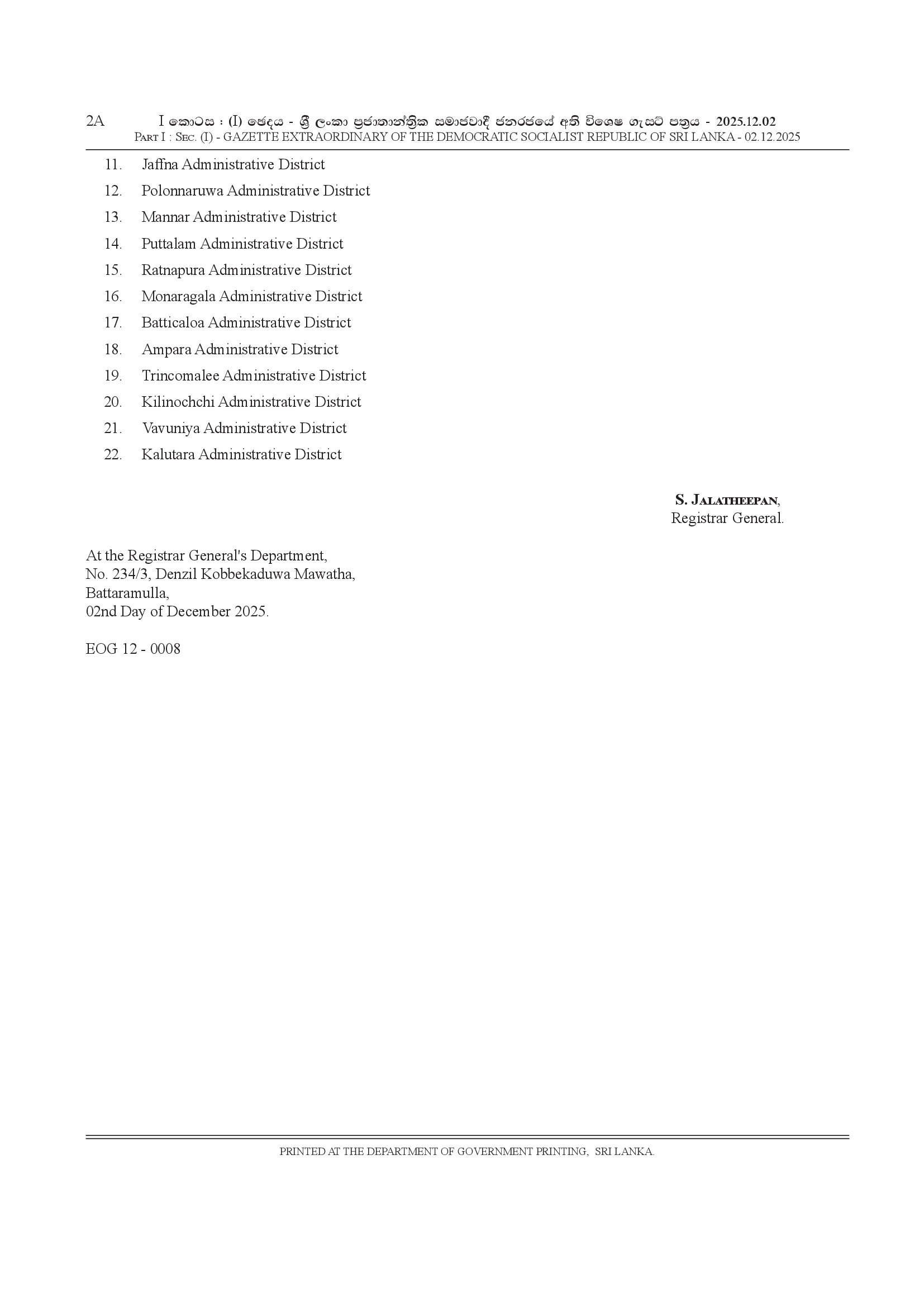 According to the Extraordinary Gazette No. 2465/08, issued on December 2, 2025, the affected districts include: