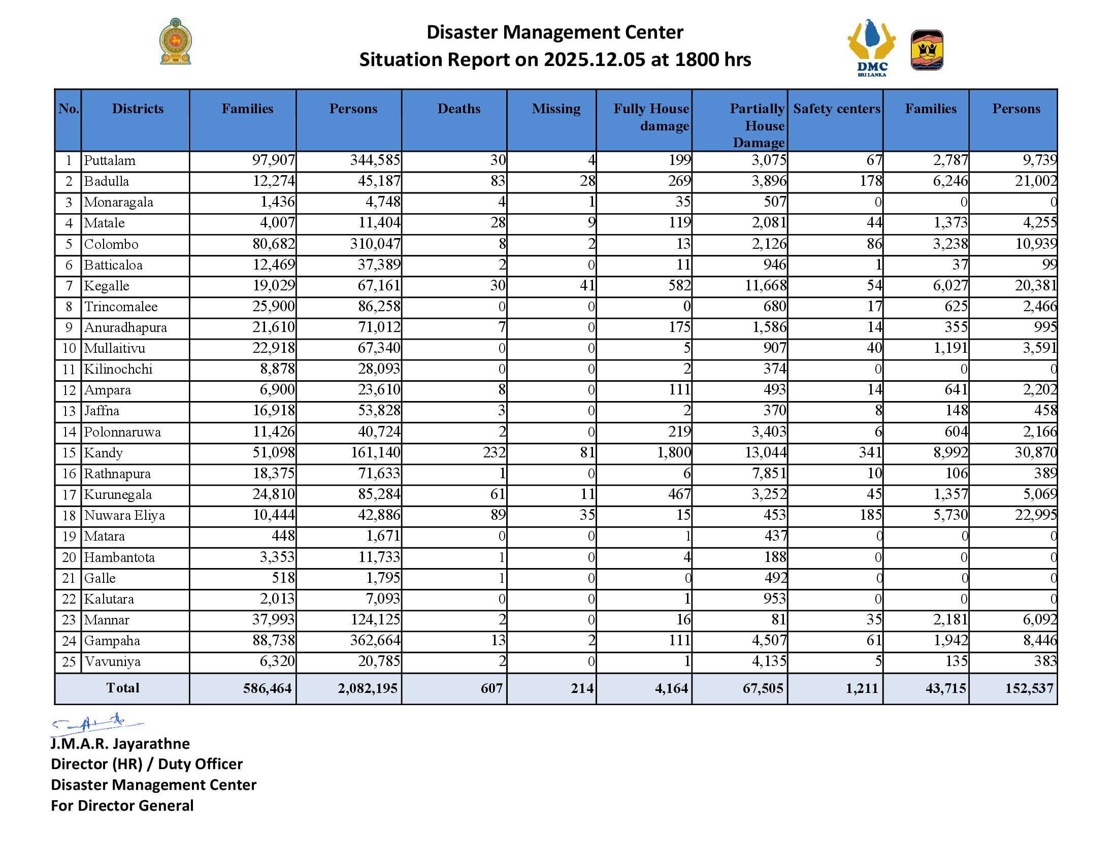 COLOMBO (News 1st); The Disaster Management Center’s latest report at 6:00 PM confirms 607 lives lost and 214 people still missing as floods and landslides ravage the island.