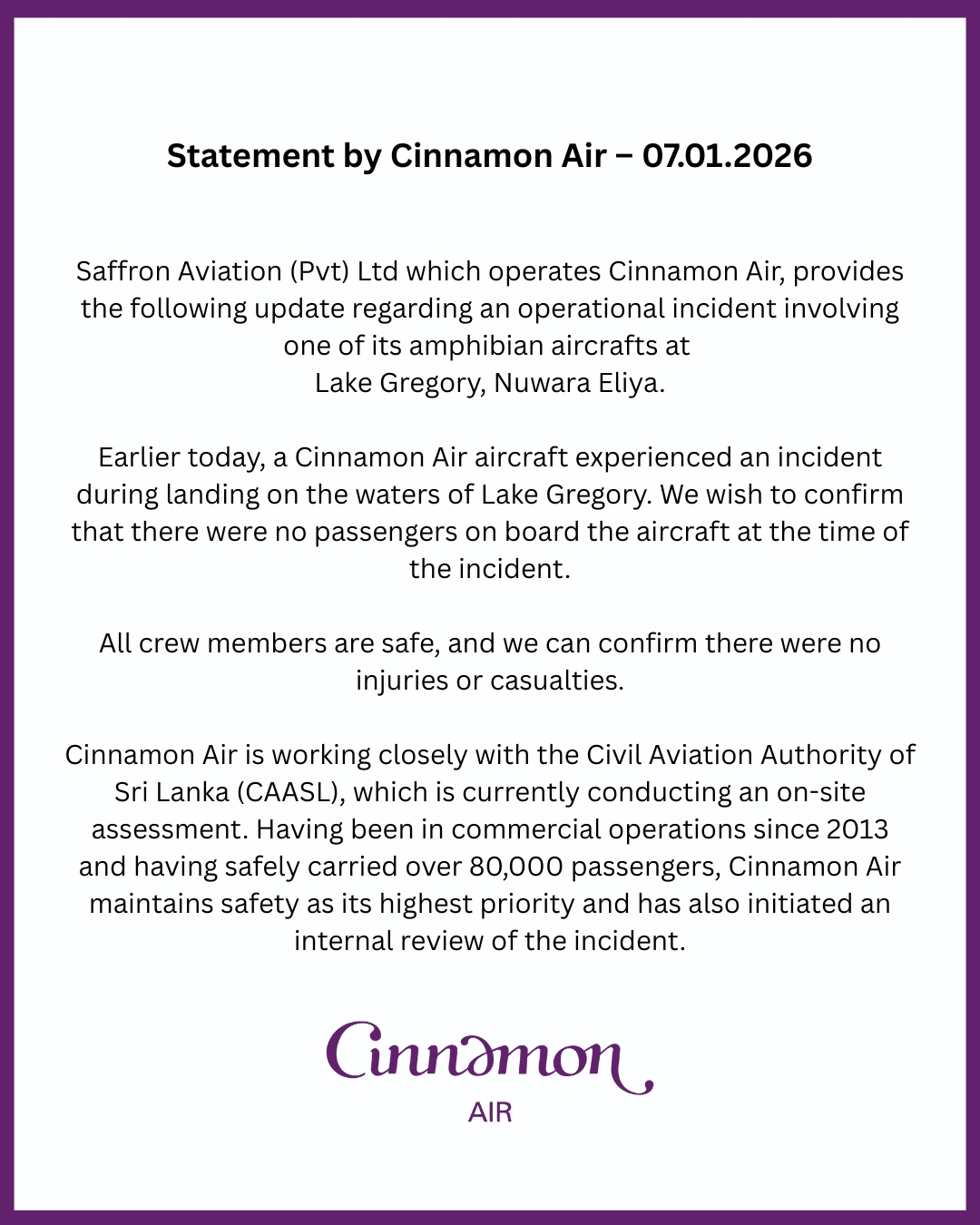 “A Cessna 208 Caravan 410 aircraft reported an incident while landing on Gregory Lake in Nuwara Eliya. Both the pilot and co-pilot were safely rescued. The Civil Aviation Authority, under the guidance of the Ministry of Ports and Civil Aviation, immediately dispatched our inspectors to the site. They are currently en route and will conduct a formal investigation upon arrival.”