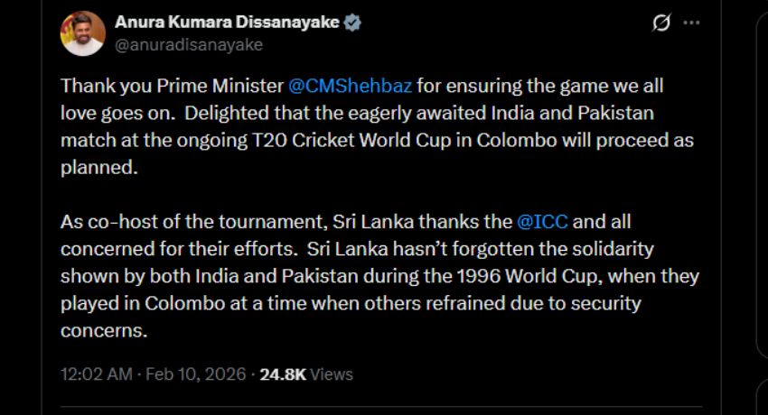 “Delighted that the eagerly awaited India and Pakistan match at the ongoing T20 Cricket World Cup in Colombo will proceed as planned,” President Dissanayake said on X.
