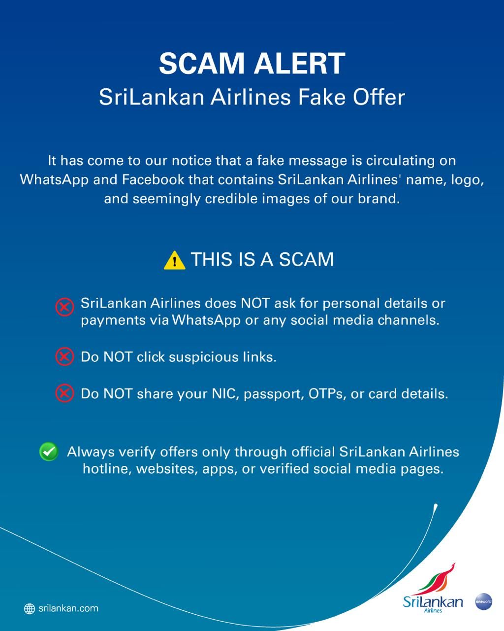 The airline encouraged the public to remain vigilant, stressing the importance of verifying authenticity before engaging with online promotions claiming to be from SriLankan Airlines.