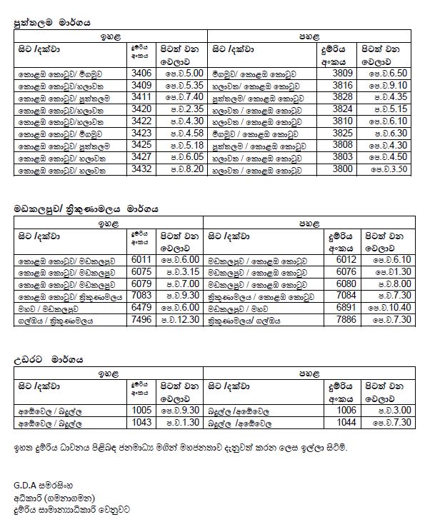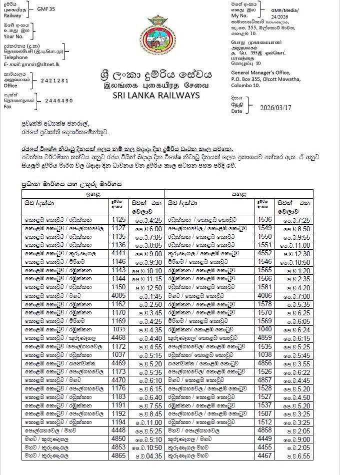 COLOMBO (News 1st); In view of the current situation, the government has declared Wednesday a special public holiday. Accordingly, the train schedule for all railway lines operating on Wednesday is as follows: