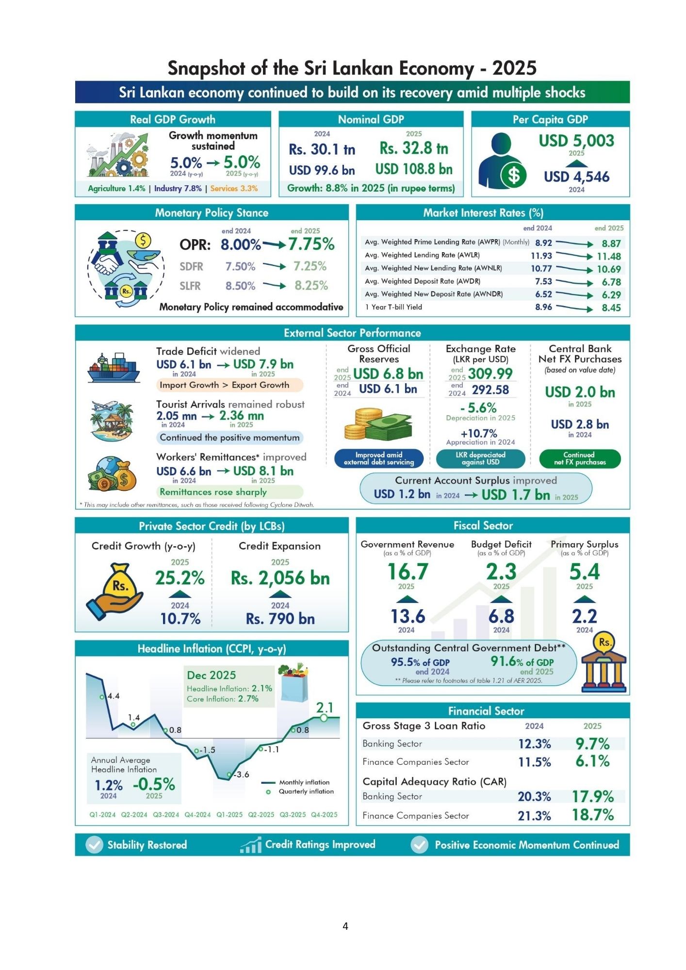 COLOMBO (News 1st); Sri Lanka’s economy showed continued recovery and improved stability in 2025, according to the Snapshot of the Sri Lankan Economy - 2025, published in April 2026 by the Central Bank of Sri Lanka.