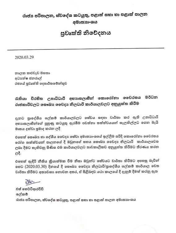 COLOMBO (News 1st) : සෞඛ්‍ය වෛද්‍ය නිලධාරී කාර්යාල වෙත අනියුක්ත කෙරුණු රැකියා විරහිත උපාධිධාරී අභ්‍යාසලාභීන් අද සේවයට පැමිණීමට අවශ්‍ය නොවන බව රජය දැනුම් දෙයි. රාජ්‍ය පරිපාලන හා ස්වදේශ කටයුතු අමාත්‍යංශය නිවේදනයක් නිකුත් කරමින් සඳහන් කළේ, ඇඳිරි නීතිය ක්‍රියාත්මක වීම හේතුවෙන් සේවයට වාර්තා කිරීමේ අපහසුතා සැළකිල්ලට ගෙන මෙම තීරණය ගත් බවයි. රැකියා විරහිත උපාධිධාරී අභ්‍යාසලාභීන්, කොරෝනා වෛරස මර්දන රාජකාරී සඳහා අනුයුක්ත කිරීමට තීරණය කෙරුණේ සෞඛ්‍ය අමාත්‍යංශයේ ඉල්ලීම මතයි.