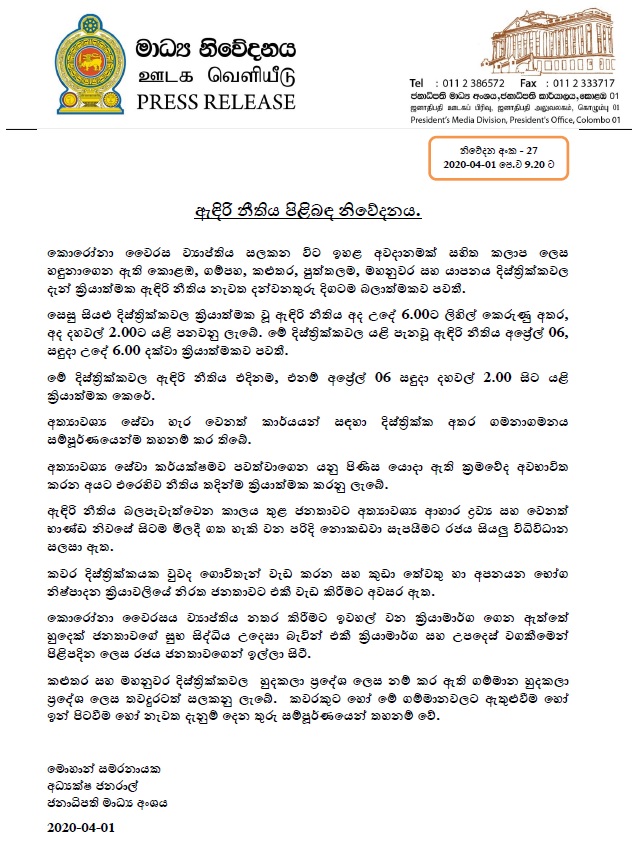 කොළඹ, ගම්පහ, කළුතර, පුත්තලම, මහනුවර සහ යාපනය දිස්ත්රික්කවලට නැවත දැනුම් දෙනතුරු ඇදිරිනීතිය බලාත්මක වේ.