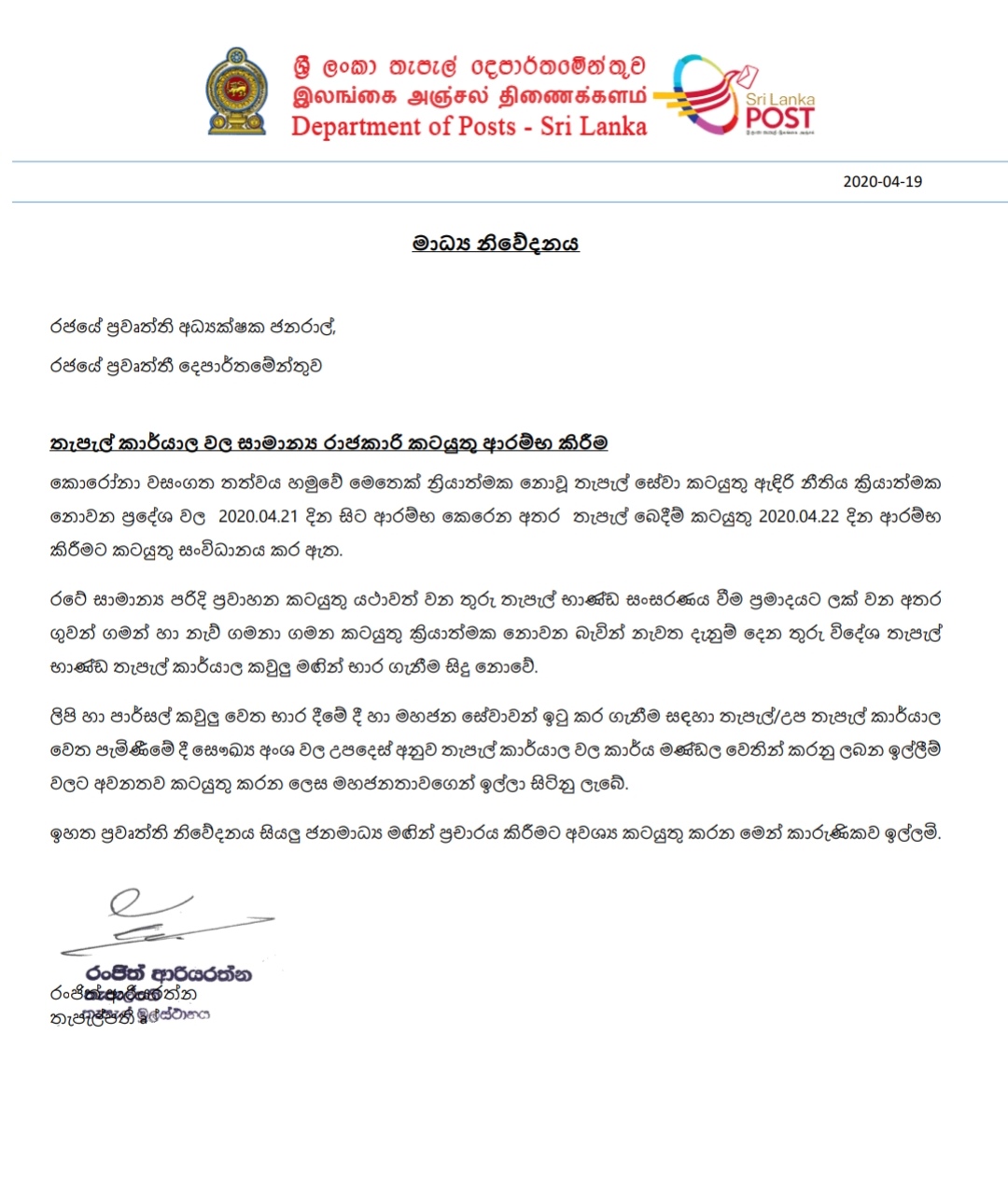COLOMBO (News 1st) - පොලිස් ඇඳිරි නීතිය ක්රියාත්මක නොවන ප්රදේශවල තැපැල් සේවා හෙට(21) සිට ඇරඹෙන අතර තැපැල් බෙදීම අනිද්දා(22) සිට ඇරඹෙන බව තැපැල් දෙපාර්තමේන්තුව පවසයි.