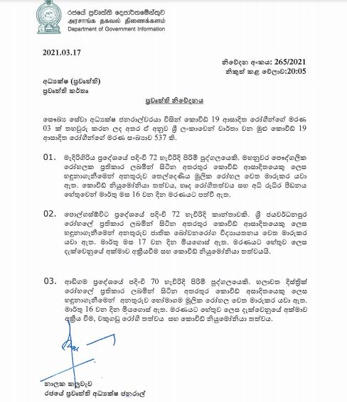 ඒ අනුව, මෙරට සමස්ත කොරෝනා ආසාදිත මරණ සංඛ්යාව 537 දක්වා ඉහළ ගොස් ඇති බව සෞඛ්ය සේවා අධ්යක්ෂ ජනරාල්වරයා පවසයි.