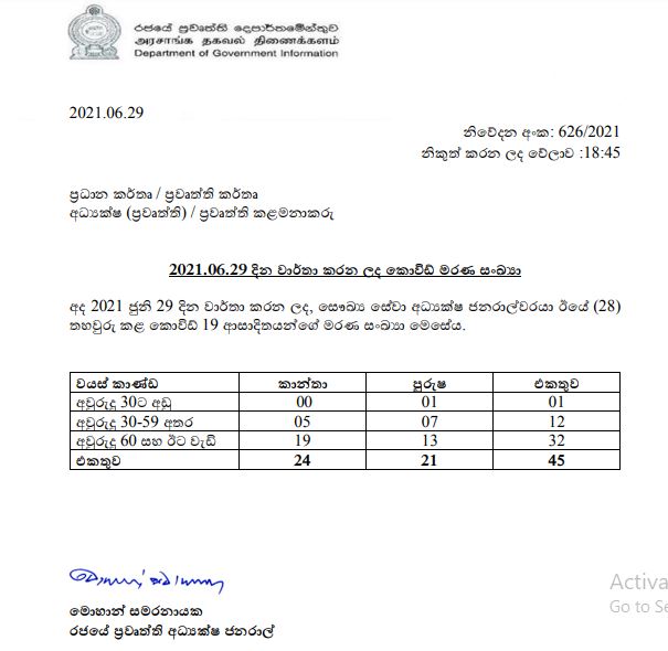 සෞඛ්ය සේවා අධ්යක්ෂ ජනරාල්වරයා විසින් ඊයේ (28) තහවුරු කරන ලද මෙම මරණ අතුරින් 21 දෙනෙකු පිරිමි පුද්ගලයින් වන අතර ඉතිරි 24 දෙනා කාන්තාවන් වේ.