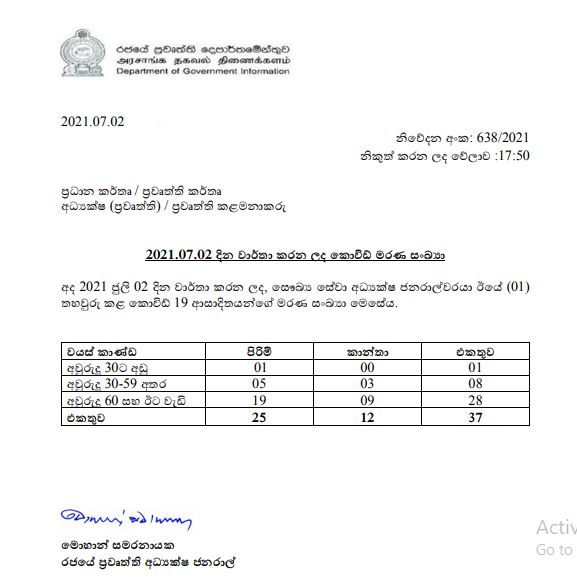 සෞඛ්ය සේවා අධ්යක්ෂ ජනරාල්වරයා විසින් ඊයේ (01) තහවුරු කරන ලද මෙම මරණ අතුරින් 25 දෙනෙකු පිරිමි පුද්ගලයින් වන අතර ඉතිරි 12 දෙනා කාන්තාවන් වේ.