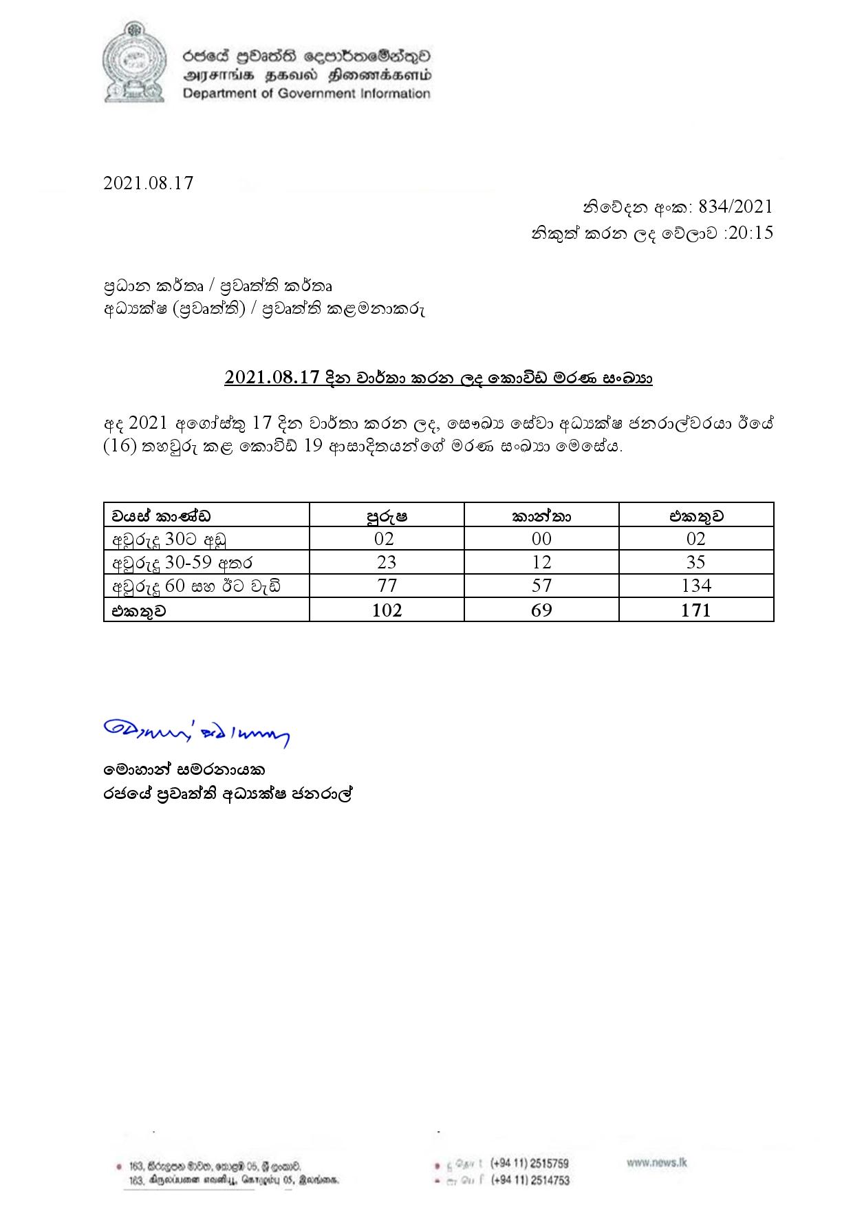 අද (17) වාර්තා කරන ලද මෙම මරණ 171 සෞඛ්ය සේවා අධ්යක්ෂ ජනරාල්වරයා විසින් තහවුරු කරනු ලැබ ඇත්තේ, ඊයේ දිනයි.