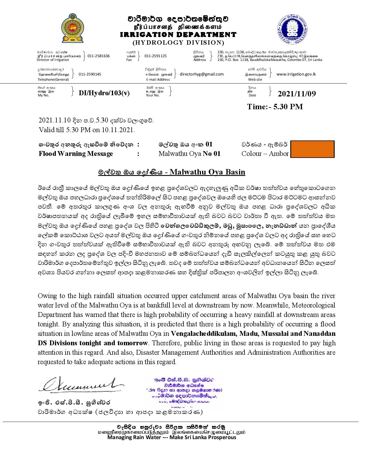 COLOMBO (NEWS1ST): මල්වතු ඔය ද්රෝණියේ පහළ ප්රදේශවල පිහිටි වෙන්ගලචෙඩ්ඩිකුලම්, මඩු, මුසාලෛ, නැනඩ්ඩාන් යන ප්රාදේශීය ලේකම් කොට්ඨාසවලට අයත් මතුවතු ඔය ද්රෝණියේ පහළ ප්රදේශවලට අද (9) රාත්රී සහ හෙට (10) දින ගංවතුර තත්ත්වයක් ඇතිවිය හැකි බවට වාරිමාර්ග දෙපාර්තමේන්තුව අනතුරු අඟවා සිටි.