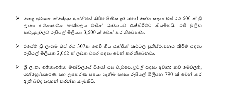 අයවැයෙන් දුර ගමන් සේවා සඳහා ලංගමට නව බස් රථ 600ක් මිලදී ගැනීමට රු. මිලියන 3600ක්.