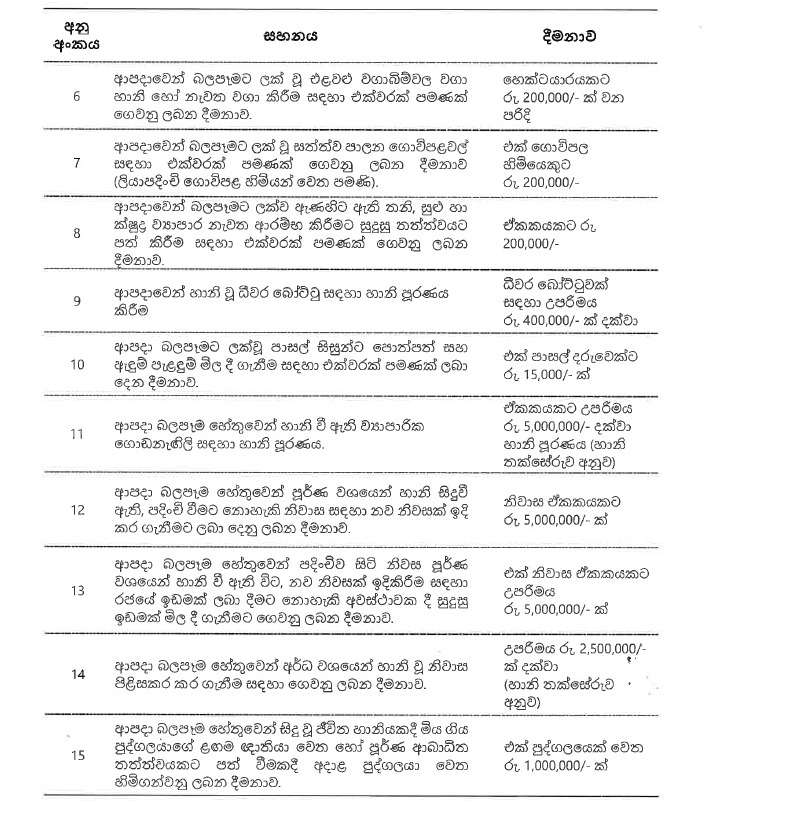 ආපදා බලපෑම හේතුවෙන් හානිවී ඇති ව්යාපාර ගොඩනැගිලි සඳහා රුපියල් පනස් ලක්ෂයක් දක්වා හානි පූර්ණ වන්දියක් ගෙවීමට නව චක්රලේඛය මගින් ප්රතිපාදන සැලසෙයි.