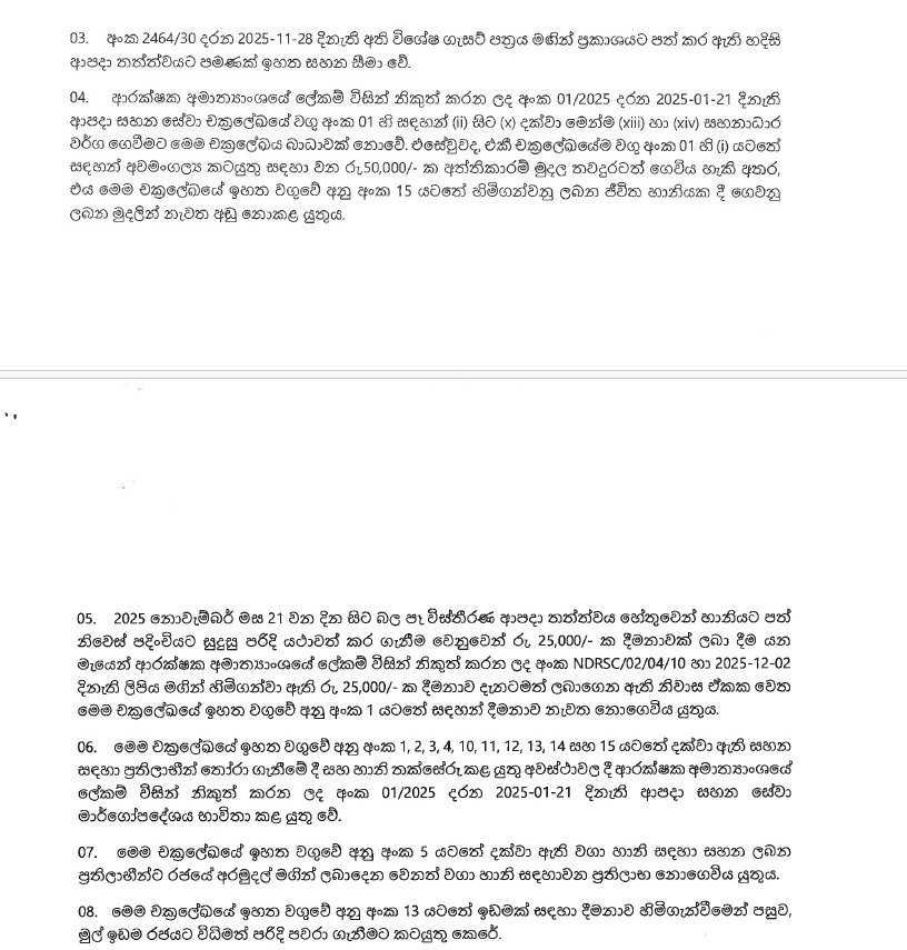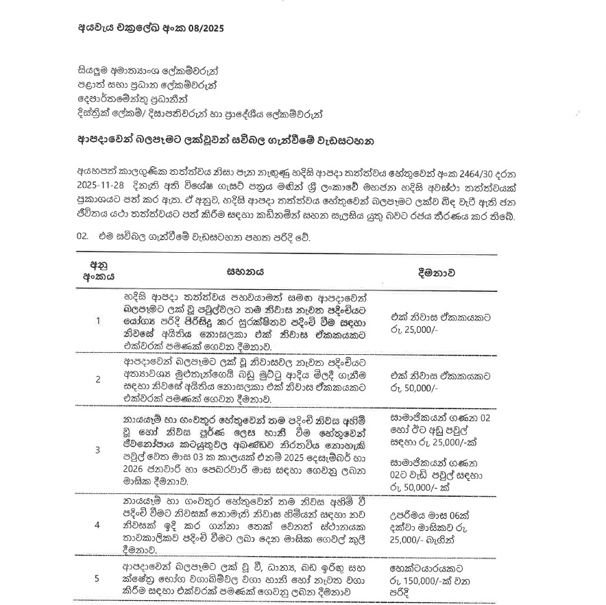 COLOMBO (News 1st) - ආපදා සහන ලබාදීමට අදාළ විශේෂ චක්රලේඛය නිකුත් කර තිබේ.
