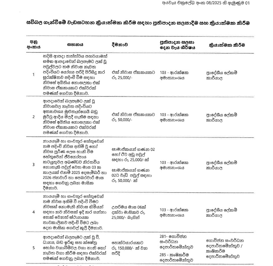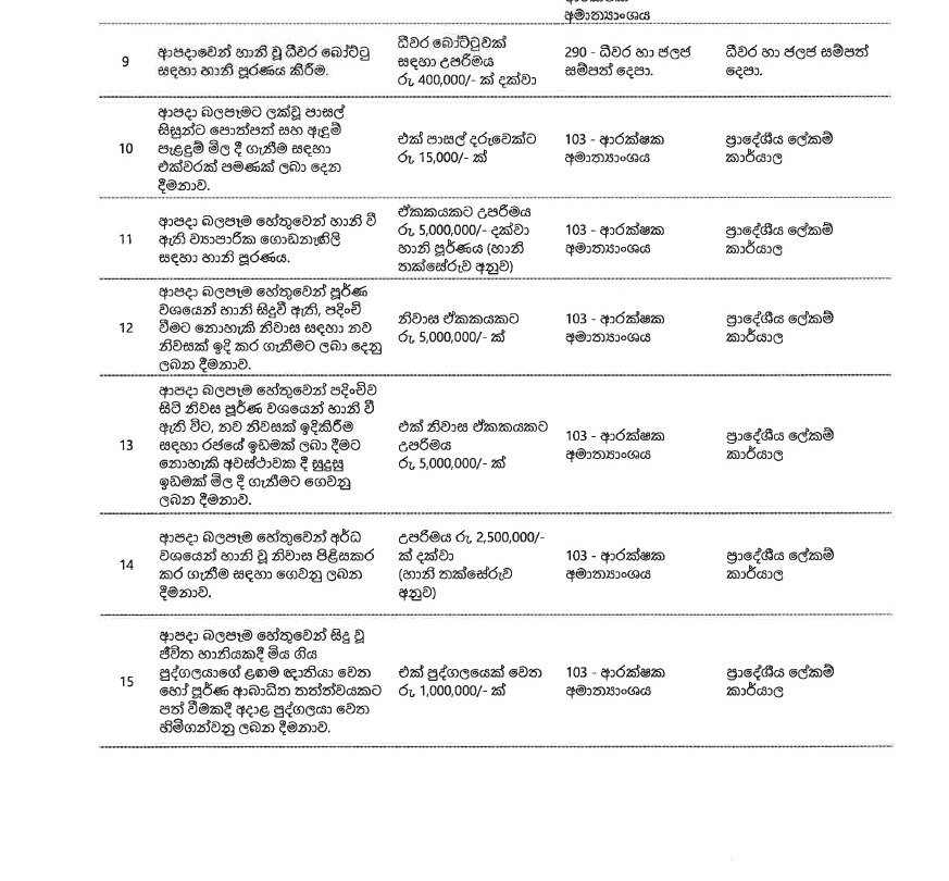 ඒ අනුව හදිසි ආපදා තත්ත්වයට මුහුණදී ඇති ජනතාවගේ ජීවිත යථා තත්ත්වයට පත්කිරීම සඳහා ශීර්ෂ ගණනාවක් ඔස්සේ සහන සලසා තිබේ.