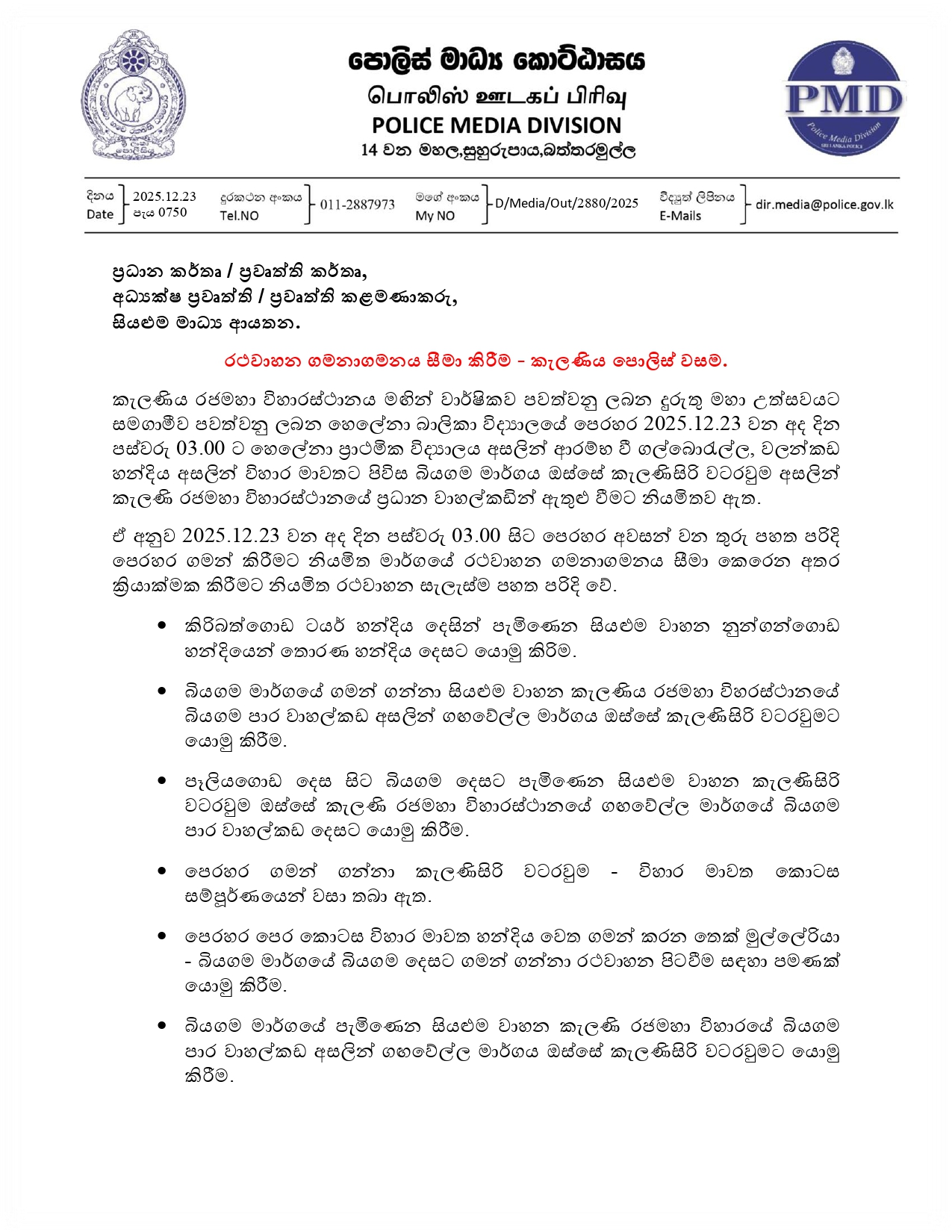 COLOMBO (News 1st) - කැලණිය පොලිස් වසම සඳහා අද (23) විශේෂ රථවාහන සැලැස්මක් ක්රියාත්මක වේ.