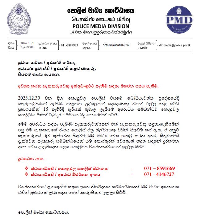 අවශ්ය කරන සැකකරුවෙකු අත්අඩංගුවට ගැනීම සඳහා පොලීසිය මහජන සහය පතයි