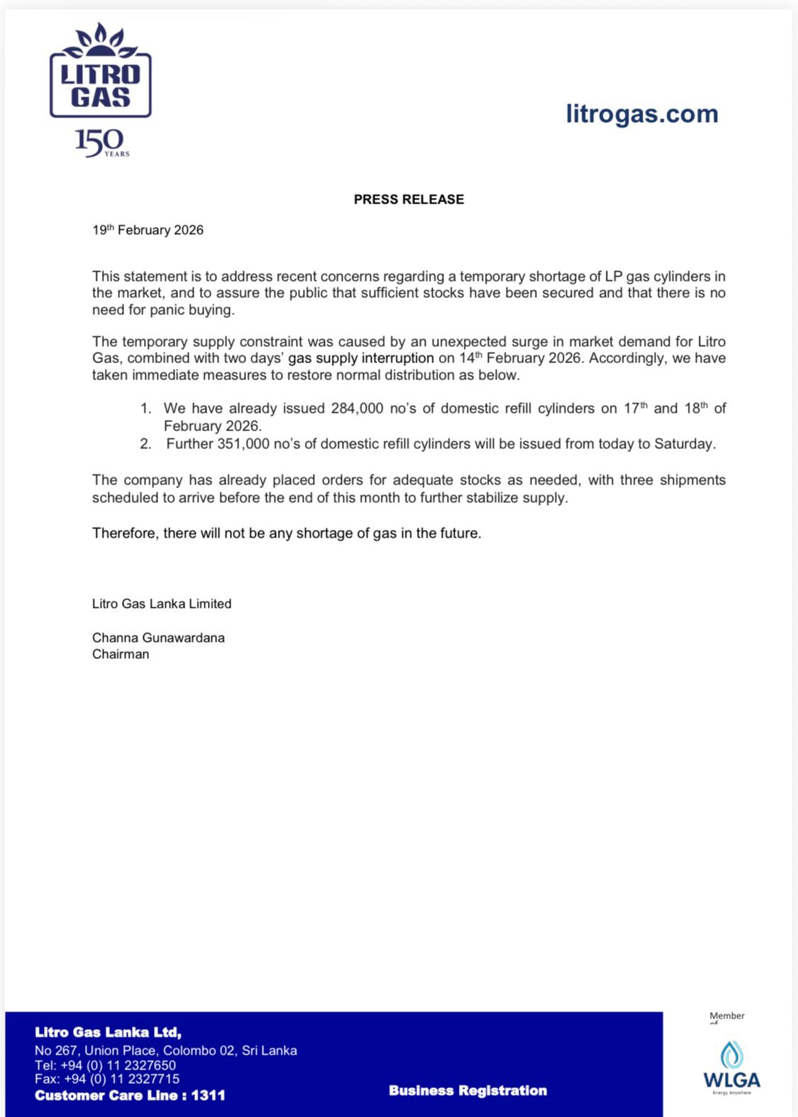 • පෙබරවාරි 17 සහ 18 යන දිනවලදී ගෘහස්ථ ගෑස් සිලින්ඩර 284,000ක් වෙළඳපොළට නිකුත් කිරීමට සමාගම පියවර ගෙන තිබේ.