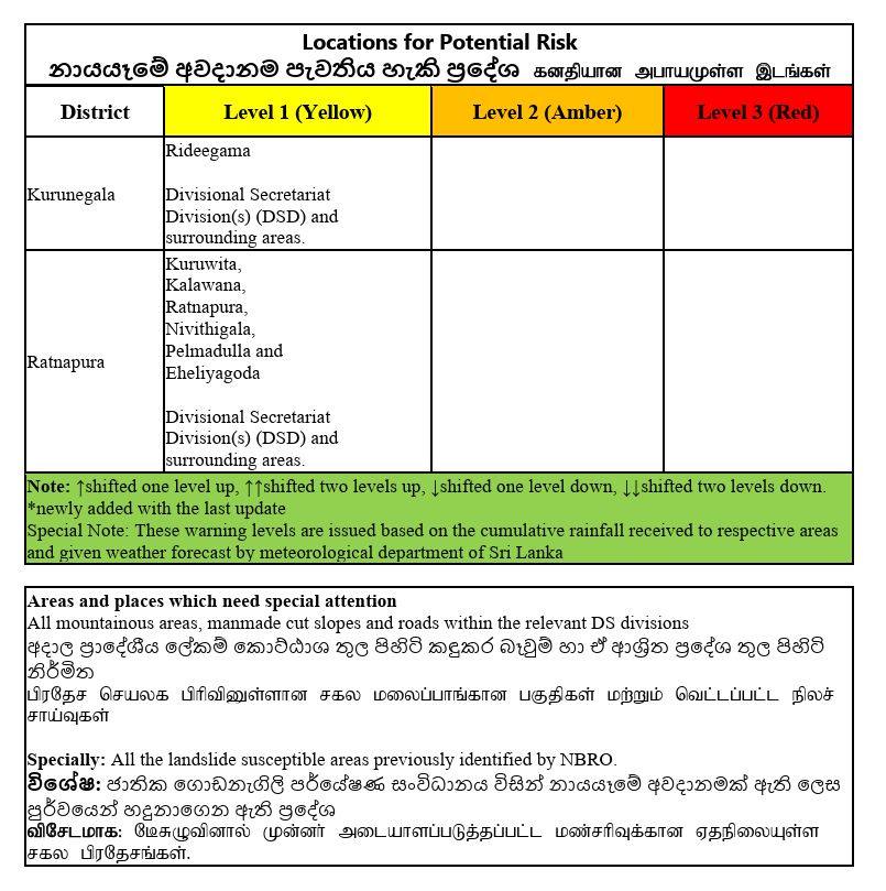 මේ අතර කුරුණෑගල හා රත්නපුර දිස්ත්රික්වල ප්රාදේශීය ලේකම් කොට්ඨාස කිහිපයකට නායයෑම් පිළිබඳ පූර්ව අනතුරු ඇගවීම් නිකුත් කර තිබේ.
