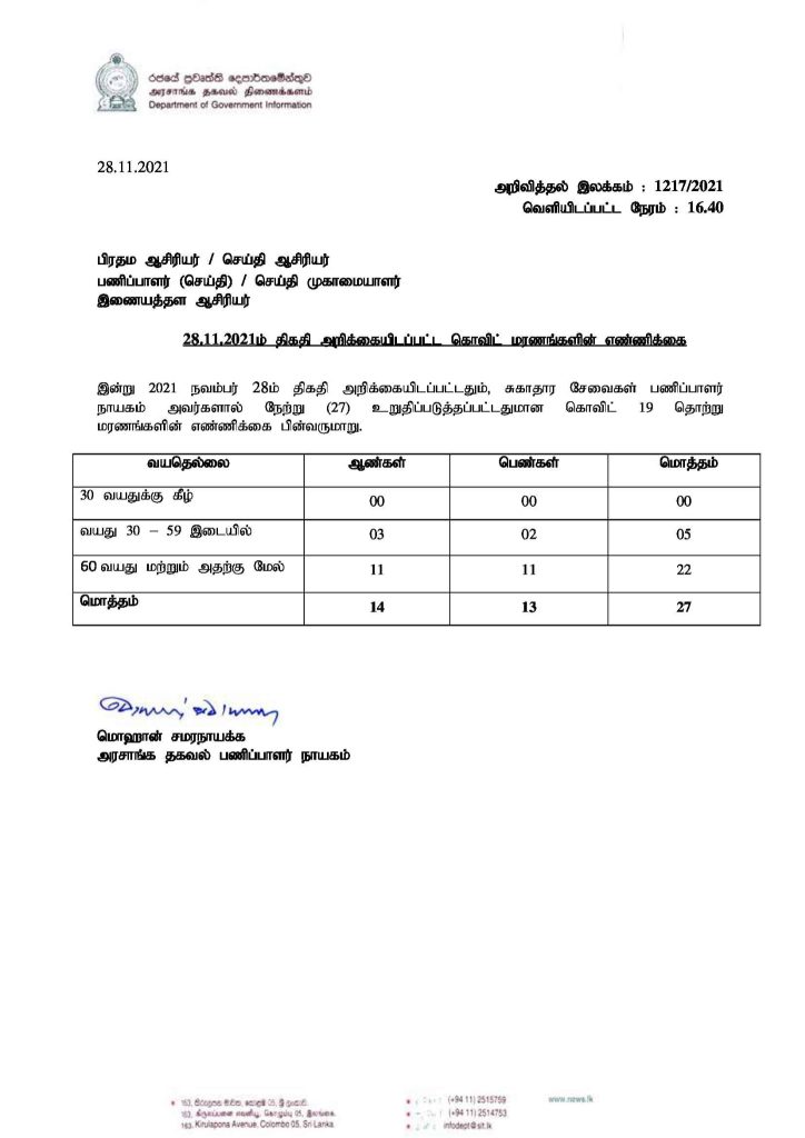நேற்றைய தினம் (27), 27 கொவிட் மரணங்கள் உறுதி செய்யப்பட்டதாக சுகாதார சேவைகள் பணிப்பாளர் நாயகம் இன்று (28) அறிவித்துள்ளார்.