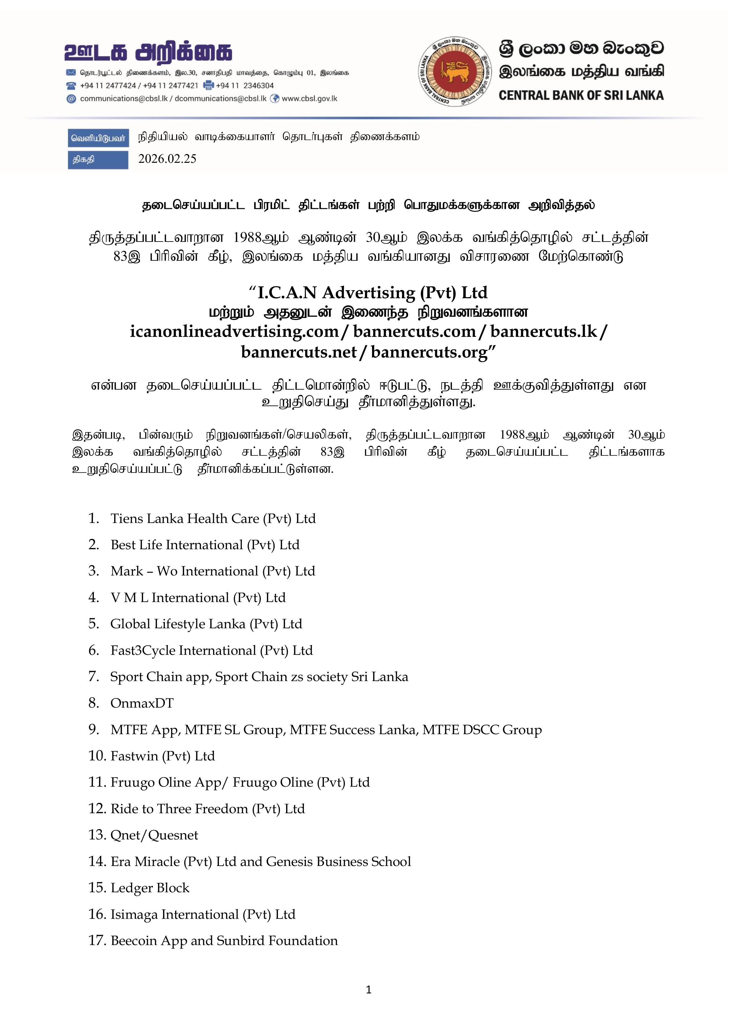 Colombo (News 1st) தடை செய்யப்பட்ட பிரமிட் திட்டங்கள் தொடர்பில் இலங்கை மத்திய வங்கி பொதுமக்களை அறிவுறுத்தியுள்ளது.